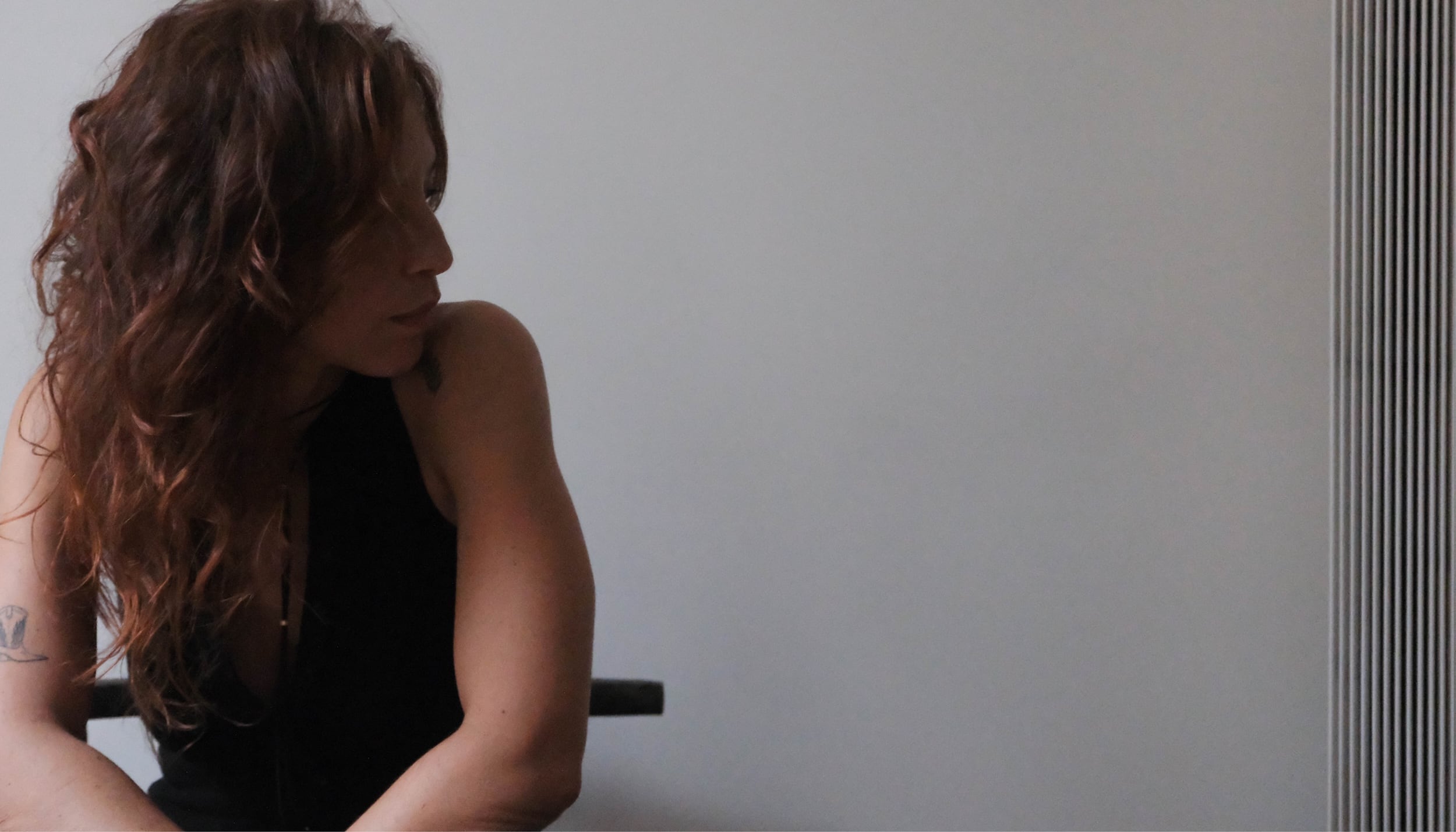 Madone. Body Noir épaules dénudées. Manches longues. Encolure carrée.